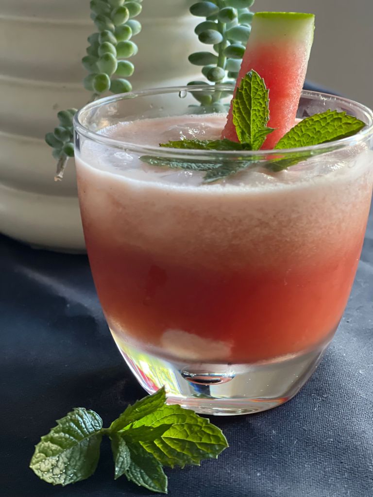 - Blend everything together and garnish with mint sprig and a watermelon spear.