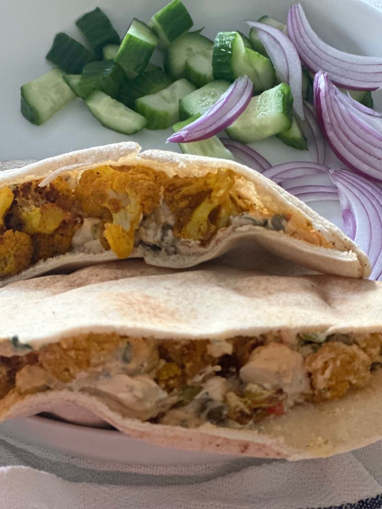 - Either spread each pocket with the labneh and add the roasted cauliflower OR mix the desired amount of cauliflower with the labneh in a bowl and stuff the pockets.