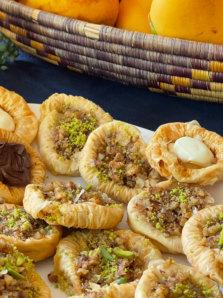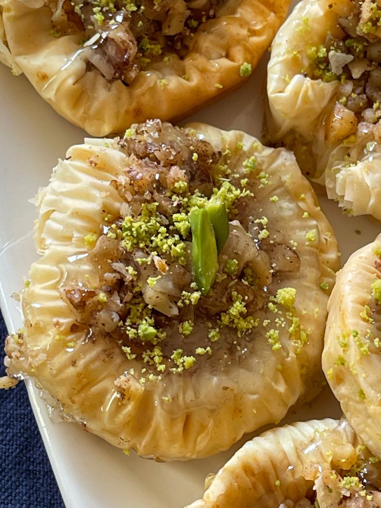 Call it a lady’s bracelet, or a lady’s navel, nightingale nest (Bulbul Yuvasi), concertina baklava, baklava coins or accordion baklava these are light and crispy bite-sized baklavas that are easily addictive.