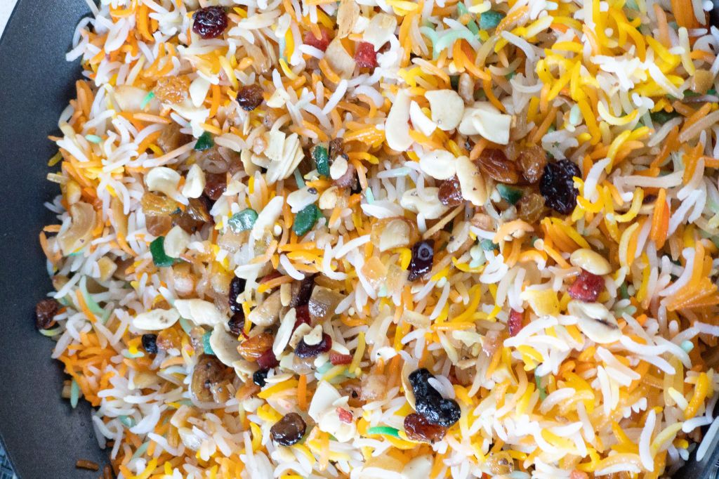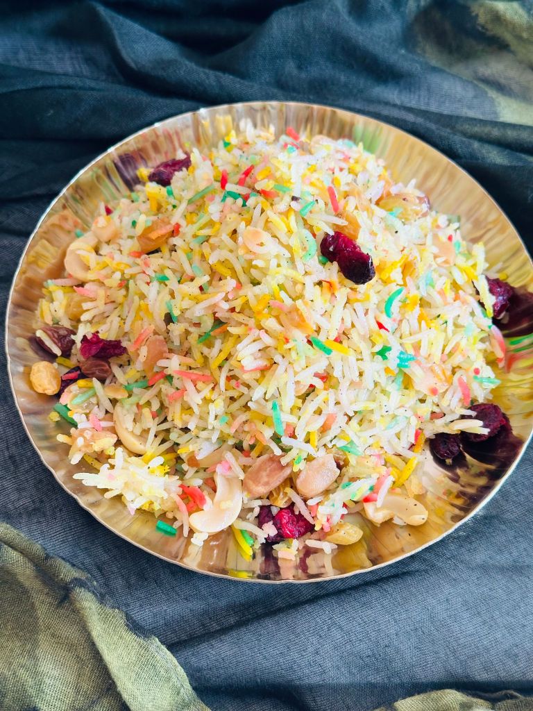 It is sweetened with sugar, raisins and tutti frutti and topped with mawa and toasted nuts, coconut and more dried fruits, silver warak (edible silver leaf) and rose petals. If this isn’t a party in your mouth, I don’t know what is.