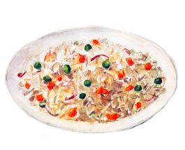 Traditionally in East Africa, this dish is made with yellow-colored rice. The version I’ve made here, however, is inspired by the Rainbow Zarda often seen in my Pakistani community in the US—featuring white rice layered with vibrant tri-colored accents.