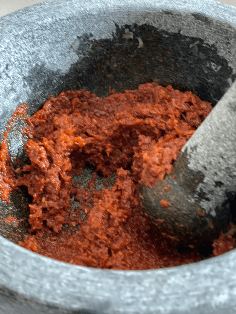 As a kid, I was somehow tasked to peel tiny little softneck garlic cloves known as ‘Kitunguu Saumu’, which unlike the huge American Elephant garlic had a strong taste and pungent smell. You would feel the burn between your nails for days! The garlic paste was hand pound using a stone mortar and wooden pestle, and then red chili powder was added, followed by sesame seeds and salt, and then finished off with a squeeze of lemon juice and a little oil.