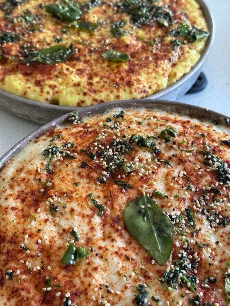 Whilst traditional Dhokra batter is made with a mix of rice and chickpea flours, khaman is made from chickpea flour with some semolina.