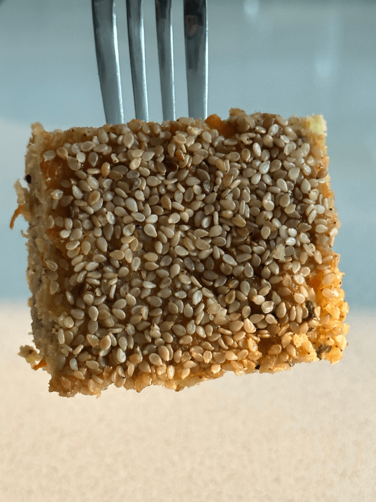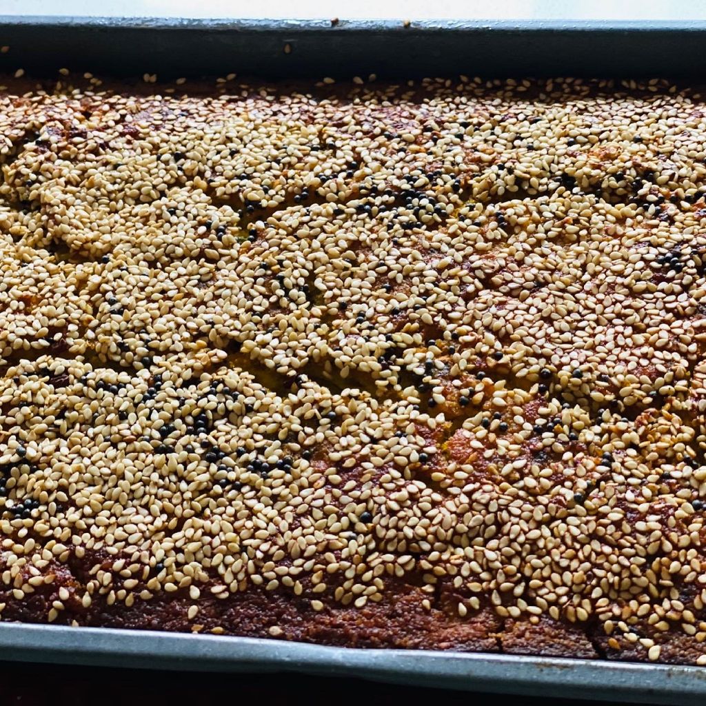 - Sprinkle the top liberally with sesame seeds; it should be totally covering the surface.