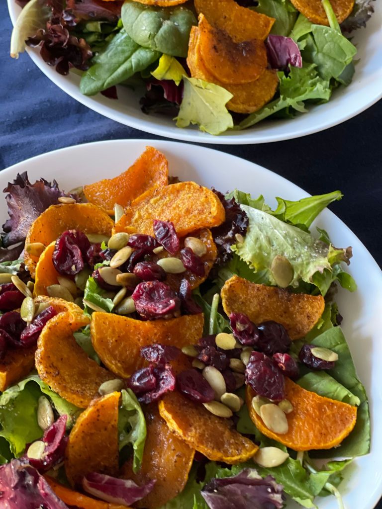 - In a large wide salad plate, lay the greens and arrange roasted squash over the surface of the salad, sprinkle with pomegranate arils, pumpkin seeds/ pepitas and cranberries.