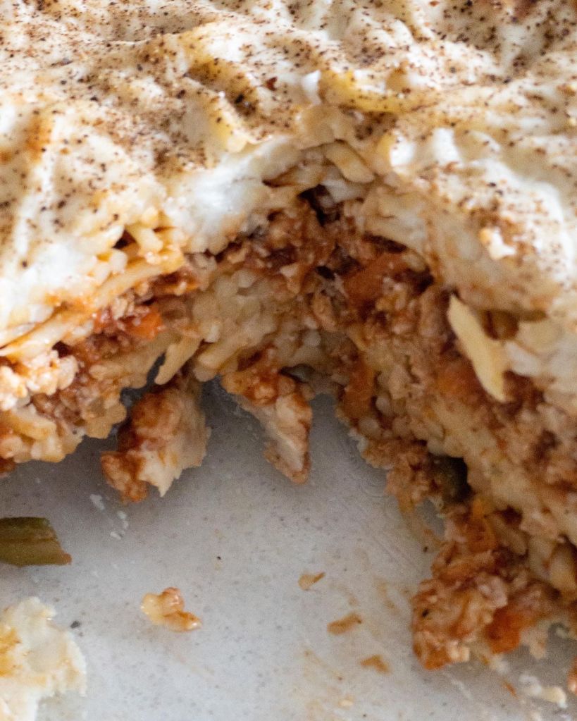 - Add ½ of the meat mixture on top and even out the layer, then add 1/3 Béchamel sauce followed by the spaghetti, repeat- so you should have 3 layers of Béchamel, 2 layers of meat sauce, and 2 layers of spaghetti.