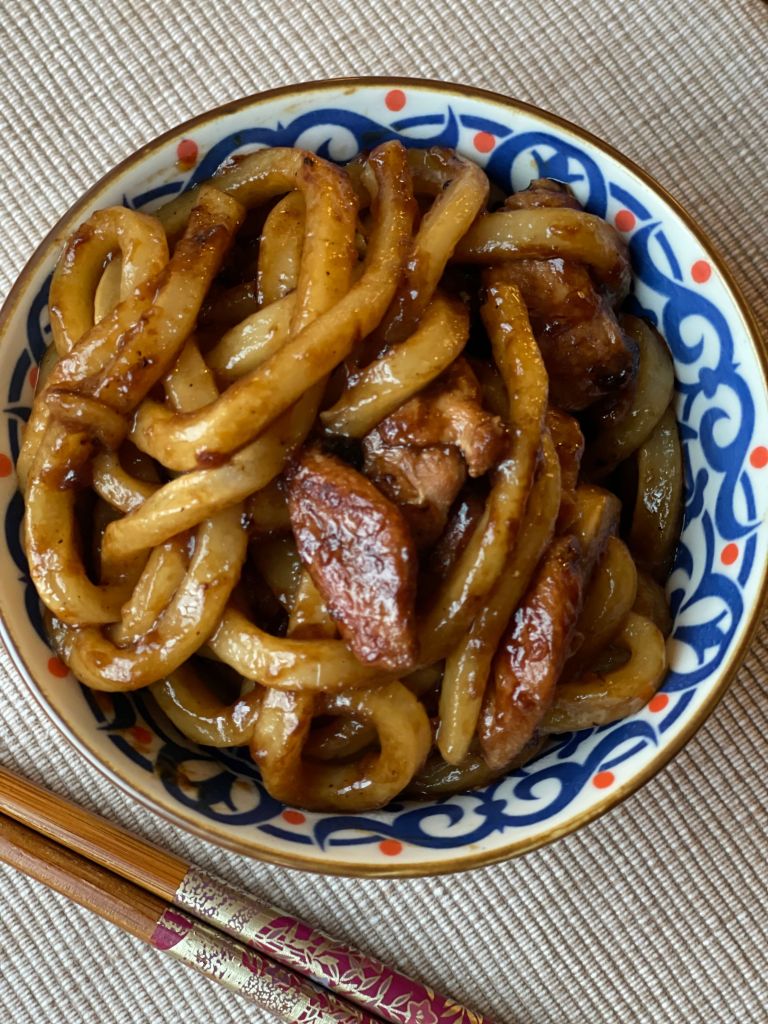 With fresh ingredients like onions, garlic, ginger, shiitake (or other) mushrooms, any veggies and your choice of protein, and really, really, thick chewy udon noodles all coated in an incredibly flavorful umami-rich sauce and speckled with sesame seeds.