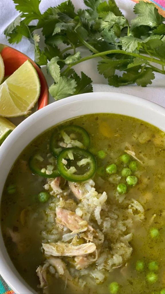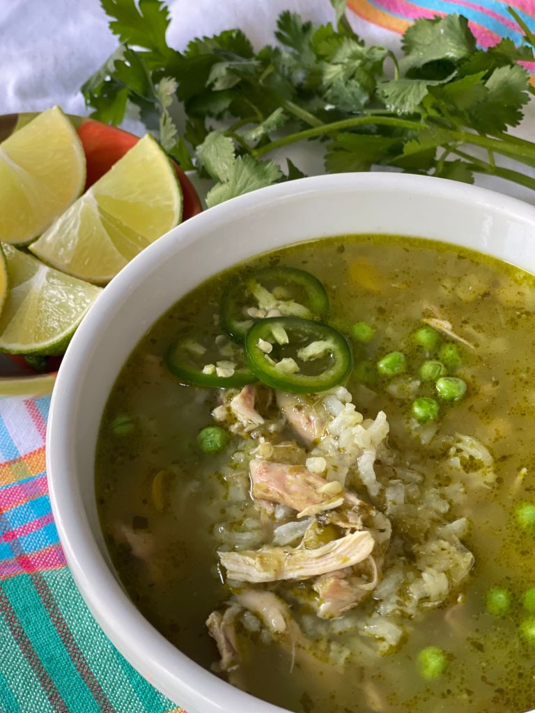 This Peruvian chicken soup recipe uses cilantro, chili peppers- aji amarillo, and lime to give it a unique flavor, veggies like carrots, potatoes, corn and peas, and the rice gives it a consistency that makes it almost like a soupy rice dish.