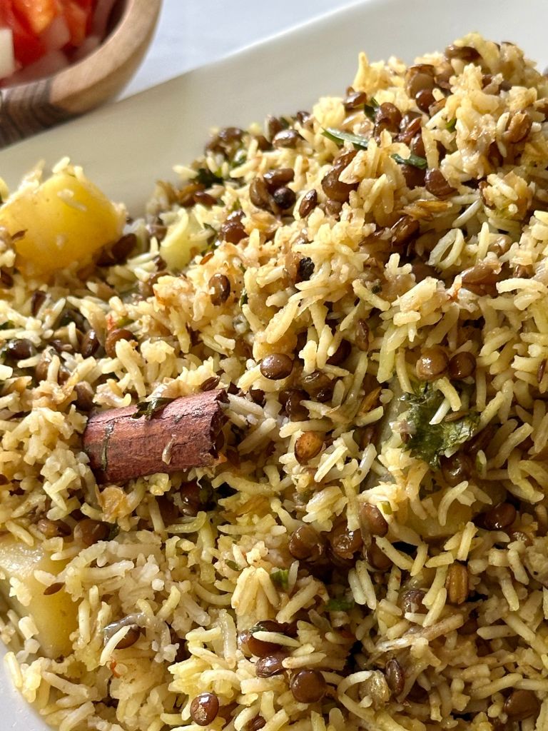 It is a one-pot vegetarian gluten-free meal, whole, rich in iron, highly nutritious, and an excellent source of plant-based protein, and vegan adaptable. It is very similar to Mujadara (mujaddara) a signature Lebanese and Middle Eastern dish of lentils, rice, and deeply caramelized onions.
