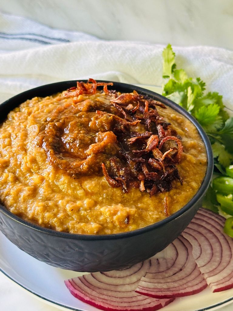 Instead of hours slaving over the stove with the heat on low, this Khichdo recipe requires just 2 hours, including prep time, and the end goal is to prepare what is considered a laborious meal in minimal time and the most delicious and luxurious Khichdo ever! Although, I must admit, it tastes better the next day as all good things tend to do. It is traditionally made with beef; I make it with Chicken (my beef and lamb issue and all), but to be honest most times I leave out the meat altogether and make it vegan, and we don’t even notice that it is vegan.