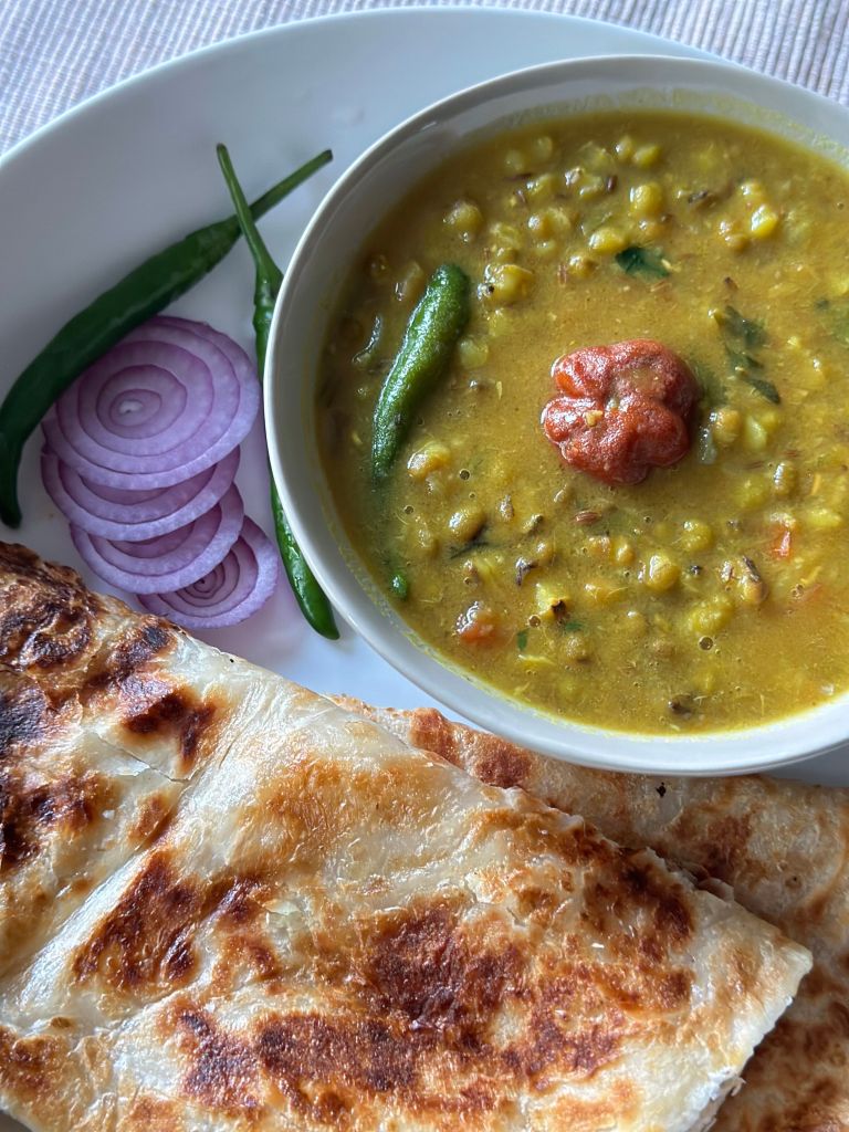 Usually Thursdays were fasting days at home, and Mum would prepare the most elaborate vegetarian taal for lunch. As part of the kathod – there sometimes was what we called jaada mag, Akha mag or thicka mag served alongside a bhinda nu shaak (Okra curry) or Kobich nu shaak (Cabbage curry) fluffy ghee smeared rotlis, rice and a side of kachumber. Although most weeknights it would be served as an evening meal with puri or parotha, a side of tarlei vadi, papdi (fryums) and a pickle when it was just us kids and Mum at home.