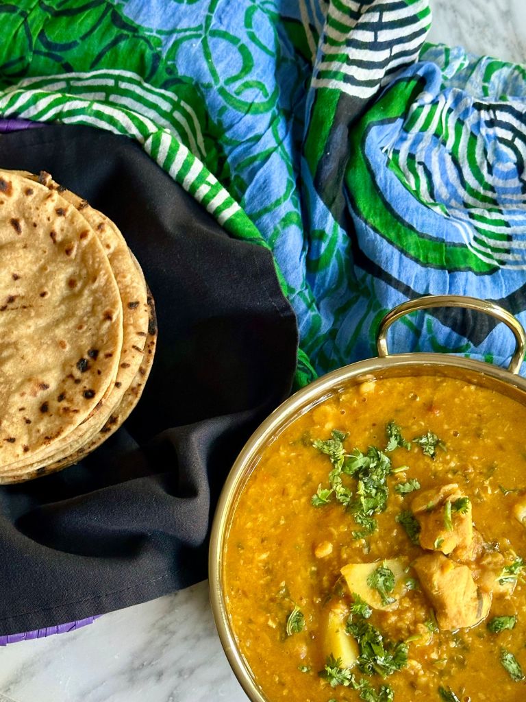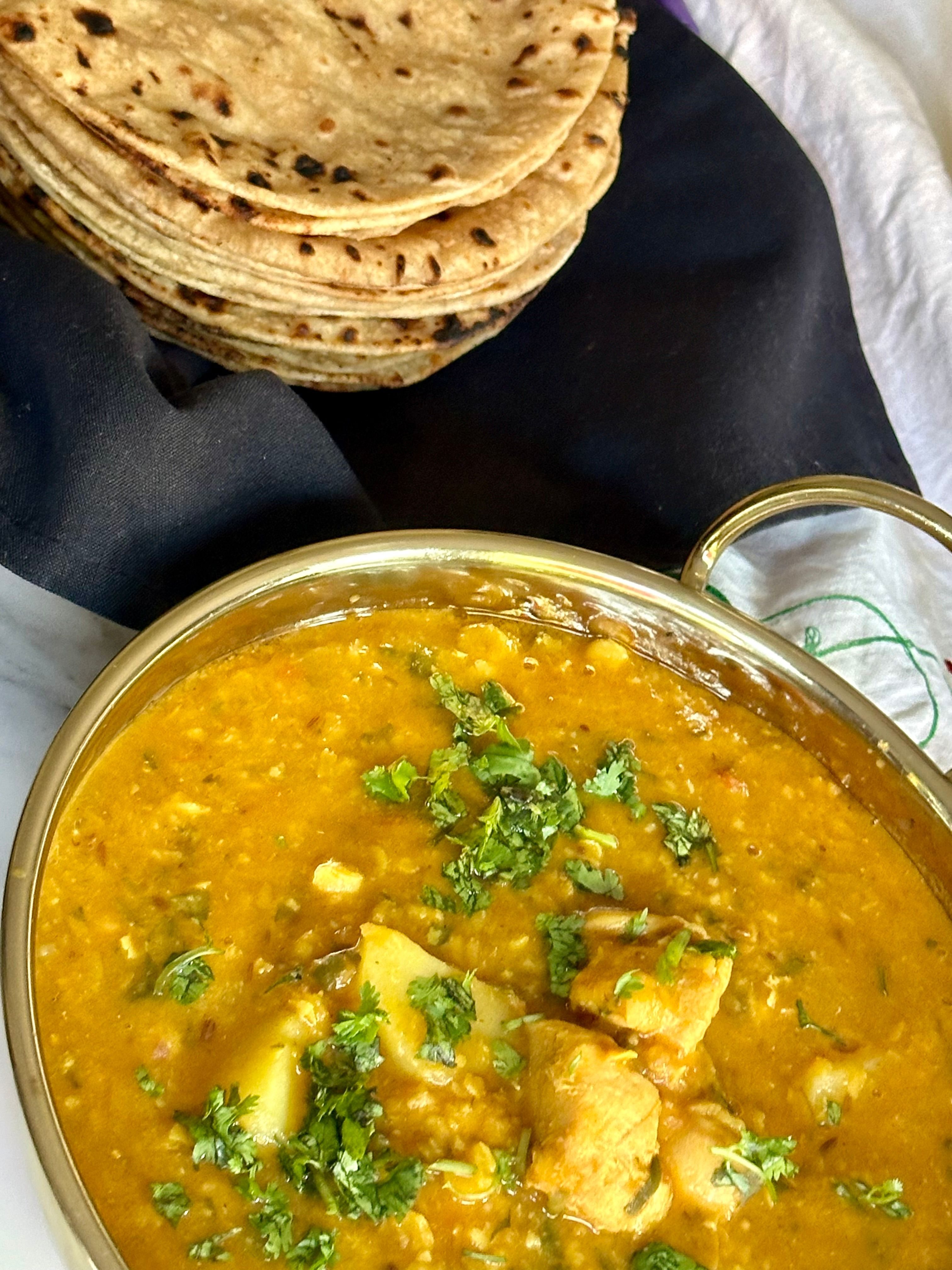 This Gosht wari Daar is a simple yet quintessential East African Khoja homestyle curry, usually made with Chana Dal (yellow split chickpeas), Toovar Dal (split yellow pigeon peas), husked Masoor dal (Split Red lentils) and any kind of red meat lamb, mutton, goat, beef, (however I make it with chicken breast). It’s usually cooked in a masala base of onions and tomatoes like most typical curries and a variety of pantry staple South Asian spices. I say this is a East African Khjoa dish, because that’s where I first came across it, but a form of this curry exits in the Bohra, Parsi and North Indian cuisines, and is especially popular at weddings.
