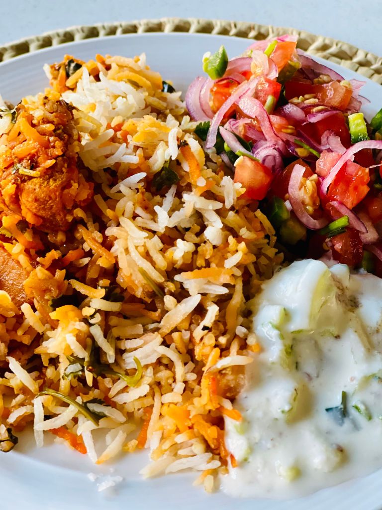 Serve the Biryani with the reserved Masala/gravy, classic kachumbari and a cooling cucumber raita.