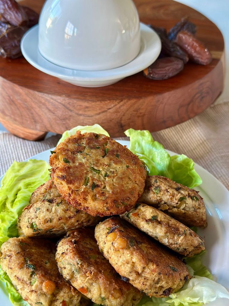 As a Ramadhan staple, every mom has an endless supply of frozen Shami kebabs to serve the unexpected guests or to pull out as a backup for Iftar. The traditional kebabs are made with lamb/mutton or beef, I make mine with chicken breasts (or a mix of breast and thigh meat) and split chickpeas peas cooked in flavorful spices, and infused with a punchy spicy “hara masala” – fresh finely chopped cilantro, green chili, and red onion. The patties are pan-fried to reinforce a crispy crunchy outer layer and preserve the kebab’s delicate inside that will melt in your mouth in a quiet explosion of flavors.