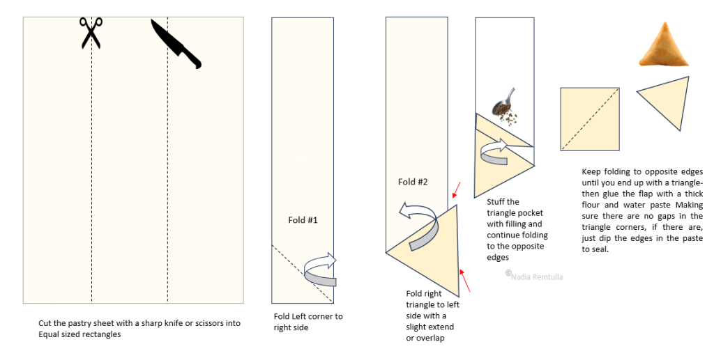 How to fold the samosas using Spring Roll Wrapper or Homemade wrappers ~ know as the“Sari Method”: