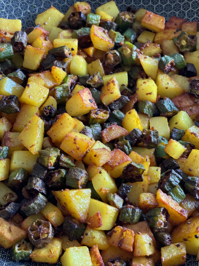 - Add the crisp okra back into the pan with the potatoes. Stir-fry over high heat for 5–6 minutes, stirring often, until you hear a gentle crackle and everything is heated through and beautifully combined.