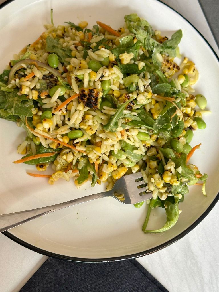 - Cut the corn off the cob. Thinly slice the remaining scallion greens, both grilled and raw. Add to the orzo along with the edamame, arugula, and any optional ingredients (red pepper flakes). Pour the dressing over and toss to coat everything evenly.