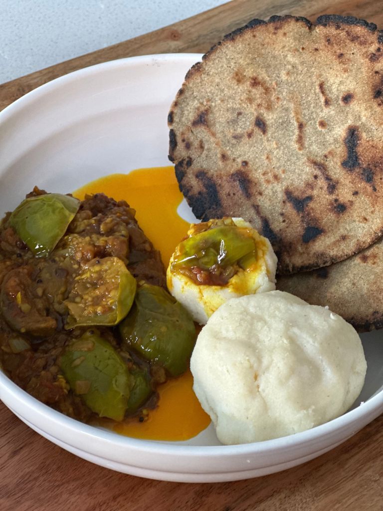 If you enjoy eggplant, this recipe is for you. Any lingering bitterness is completely balanced by the garlicky oil and gentle spice. I usually eat this with Gujarati rotli, or with ugali. I shape a small portion of ugali by pressing it between my fingers and palm to form a soft ball, then create a shallow dip; the hollow is used to pick up curry or stew, allowing the ugali to function as both food and utensil.